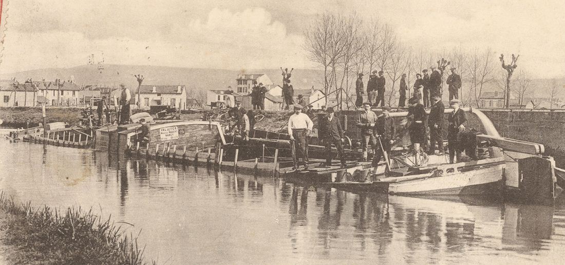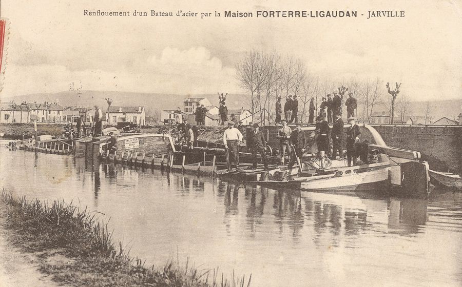 La localisation de la prise de photo n'est pas très claire, malheureusement. La légende indique Jarville, mais ça doit être parce que la maison Forterre-Ligaudan est de Jarville. Intéressons-nous à ce qu'on peut lire au dos de la carte, pour en savoir plus. Elle a été écrite (par un marinier) à Ménaucourt, dans la Meuse, vallée de 70 (canal de la Marne au Rhin). Elle est adressée à un habitant de Thonnance-les-Joinville, en Haute-Marne, à côté du canal de la Marne à la Saône... La correspondance n'évoque pas le renflouement d'un bateau. Auguste Hermann, qui l'a écrite, indique qu'il est arrivé à Ménaucourt la veille du dix décembre 1913, et qu'il va charger pour Nancy.