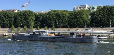 Le 27 mai, avalant le matin dans Paris, ce bateau (Strasbourg?) . Pas de devise , et trop loin pour lire l'immatriculation, mais P.....F.