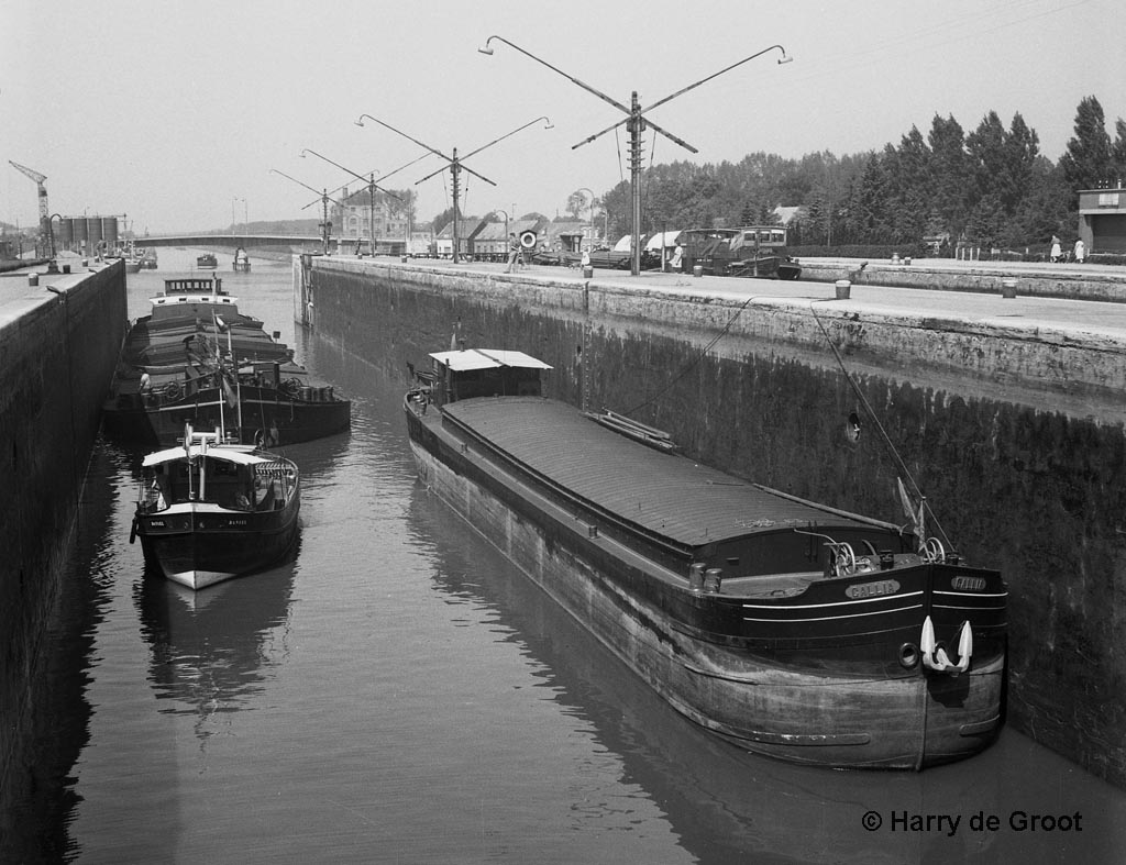 Le GALLIA dans l'écluse de Wijngem au Canal Albert. Nom du remorqueur: Daniel et chaland Maria II.