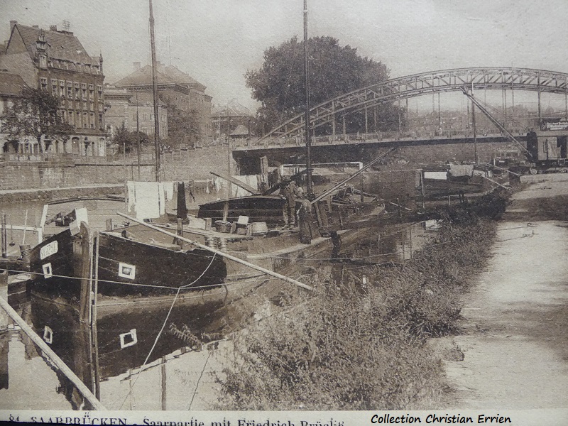 Une jolie cpa de Sarrebrück avec au premier plan un bateau immatriculé STC 579 F