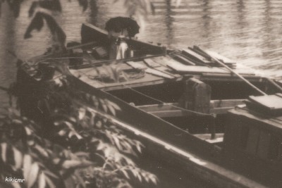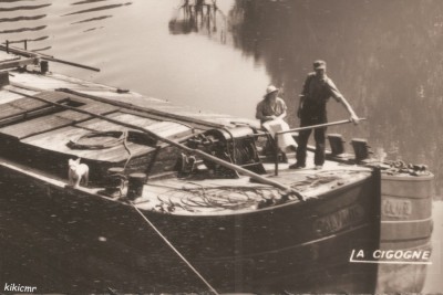 A l'avant, le marinier au bouteur, la marinière qui coud, et le chien qui surveille le tirage :