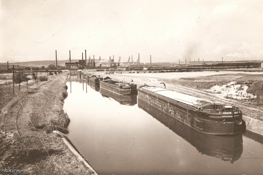 Une carte postale, écrite en mai 1952, de l'embranchement d'Hagondange du Canal des Mines de Fer de Moselle (CAMIFEMO) :