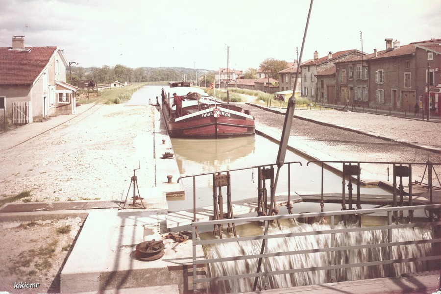 Cette photo originale est une "épreuve sommaire tirée hâtivement" de J. Combier, de Mâcon, célèbre éditeur de cartes postales (beaucoup de cartes semies-modernes signées CIM, pour Combier Imprimeur Mâcon). Au dos, il y a une date manuscrite : 12 juin 1967 ; on peut penser que c'est la date à laquelle la photo a été prise. Il y a aussi un nom tamponné : Lussiez ; sur d'autres épreuves, on trouve "opérateur : Lussiez", ça pourrait être le nom du photographe. Et une légende écrite à la main : "Fains-les-Sources (Meuse) 55 - Canal et écluse". Je pense que cette épreuve n'a jamais été tirée en carte postale, ou en tout cas je n'en ai jamais vu un seul exemplaire.
