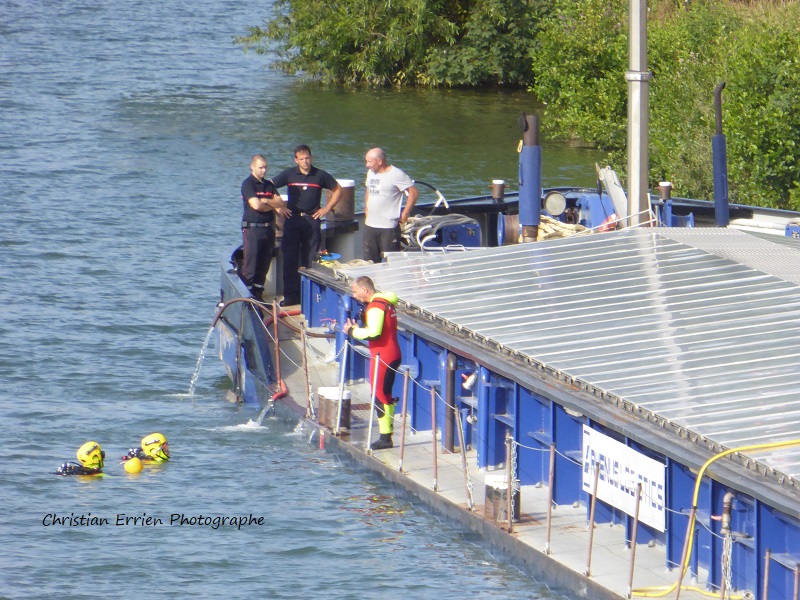 De passage sur St Mammès ce bateau sans doute trop chargé a fait une voie d'eau. Il est ici amarré chez Bouillet ou les pompiers inspectent la coque.