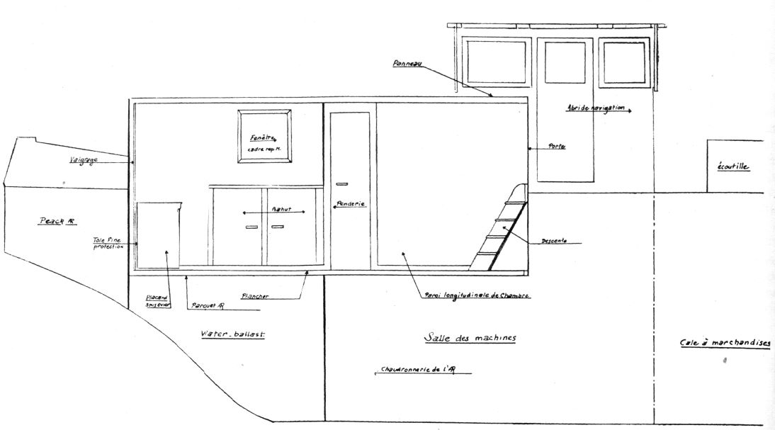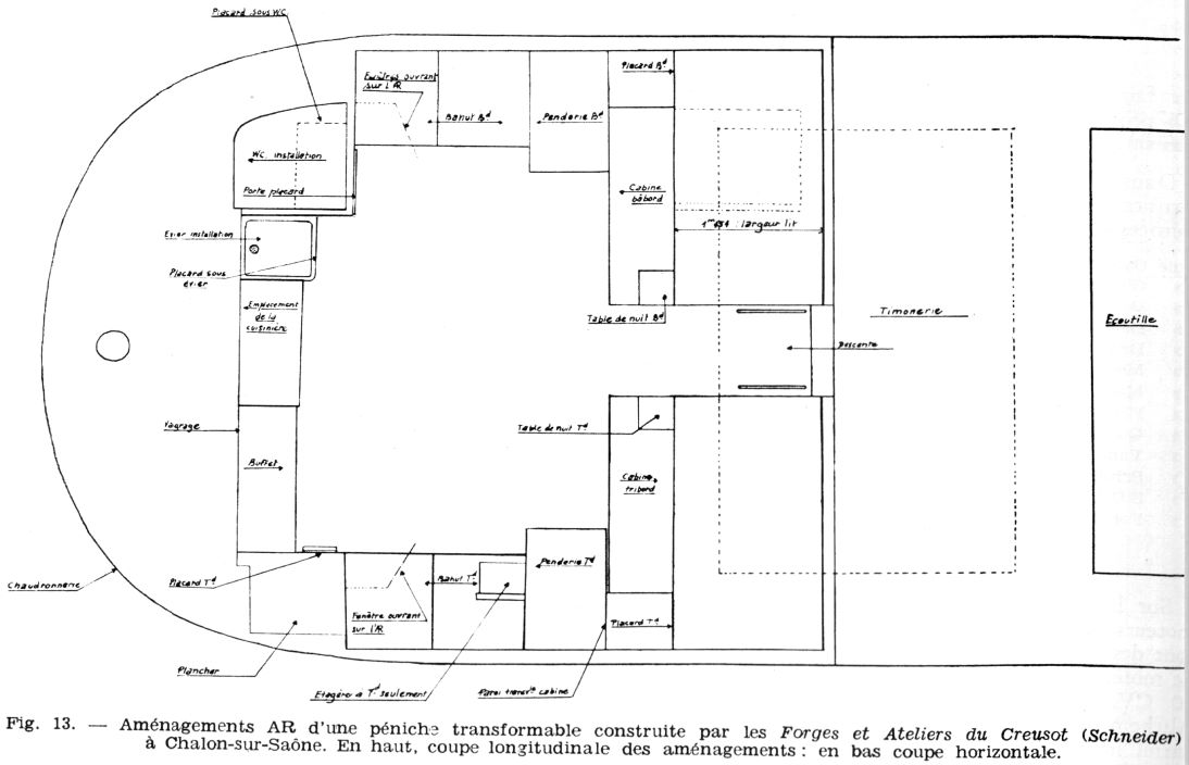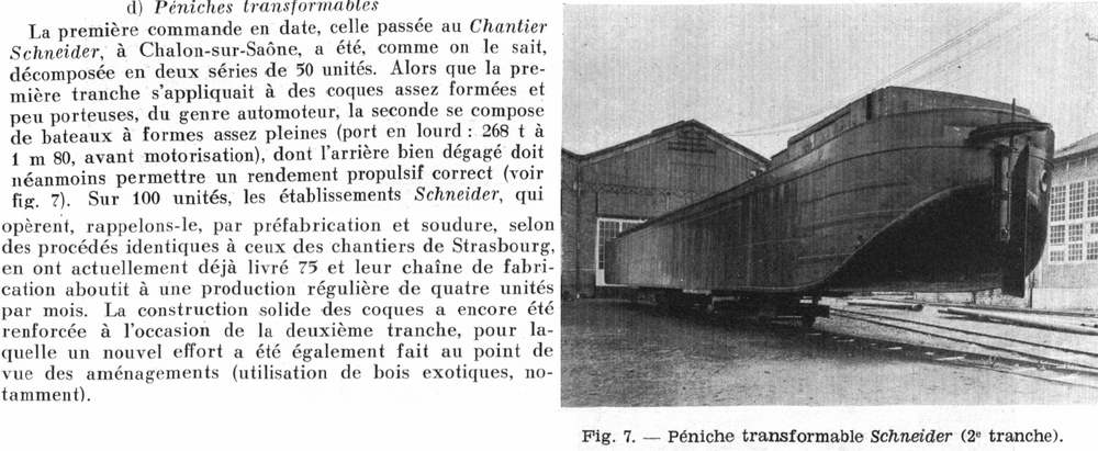 Ce type de bateau n'est pas muni d'appareil propulsif, mais la possibilité de l'équiper en automoteur est réservée pour l'avenir. A cet effet, un emplacement pour le moteur est prévu à l'avance, dans les aménagements AR ; en outre, les formes sont telles que le bateau, avant d'être exploité en automoteur, a un port en lourd suffisant pour que les conditions d'exploitation en péniche tractée soient satisfaisantes. Certes, c'est là un compromis difficile, car l'obtention de ce port en lourd - toujours au détriment des formes - est incompatible avec la recherche, après transformation en automoteur, d'une bonne vitesse, qui réclame, au contraire, des formes affinées.