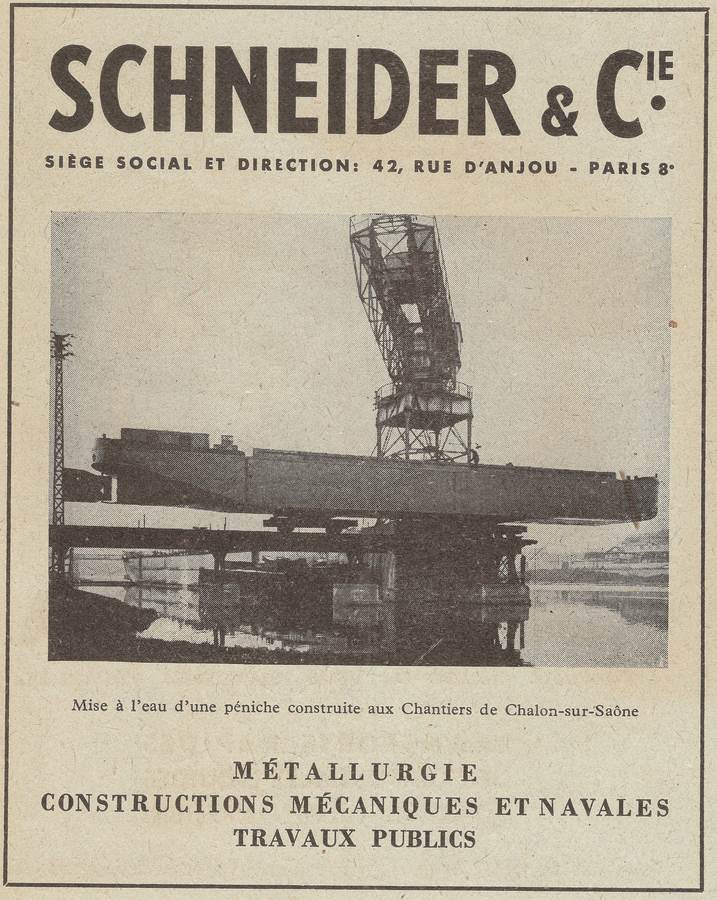 Dans "La navigation du Rhin - Revue de la navigation intérieure" de juillet 1949, on apprend qu'après l'inauguration officielle, le 23 juin 1949, du nouveau port fluvial de Chalon-sur-Saône, les participants se sont rendus aux usines Schneider et Cie, où M. Jardy, le directeur, leur a fait visiter les installations. L'article est élogieux sur la qualité du travail exécuté au chantier : "