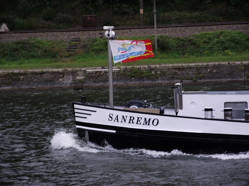 A la même écluse de Floriffoux sur la Sambre, le Pareatis croise le SAN REMO ex Conspiro, ex Conolia, ex Candia, ex Donau Maru; construit en 1954 au chantier J.G. Hitzler à Lauenburg en Allemagne; 80 x 8,25 m. et 1146 T.