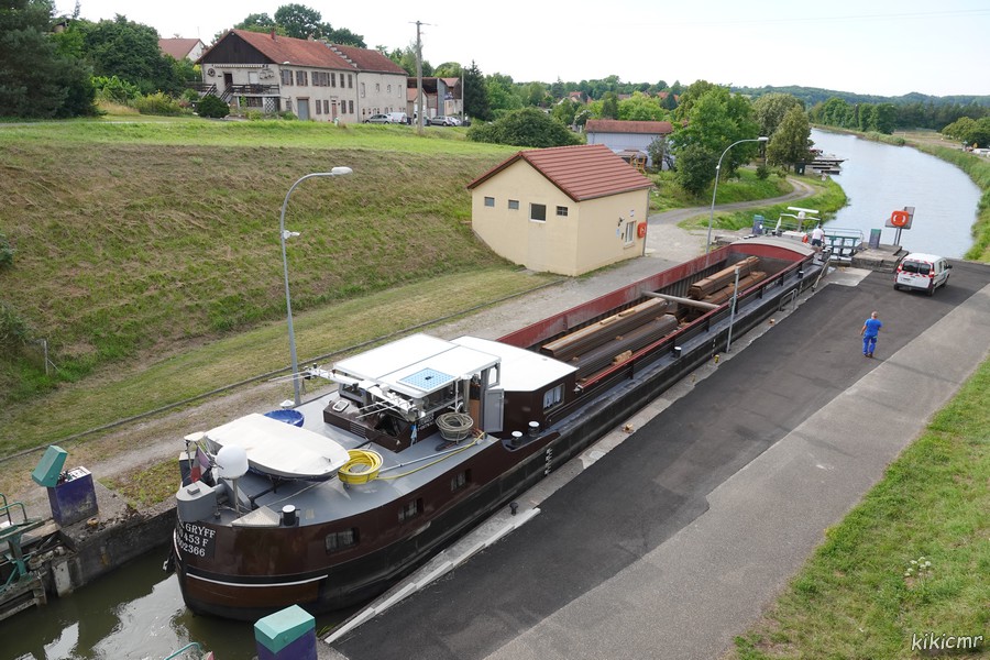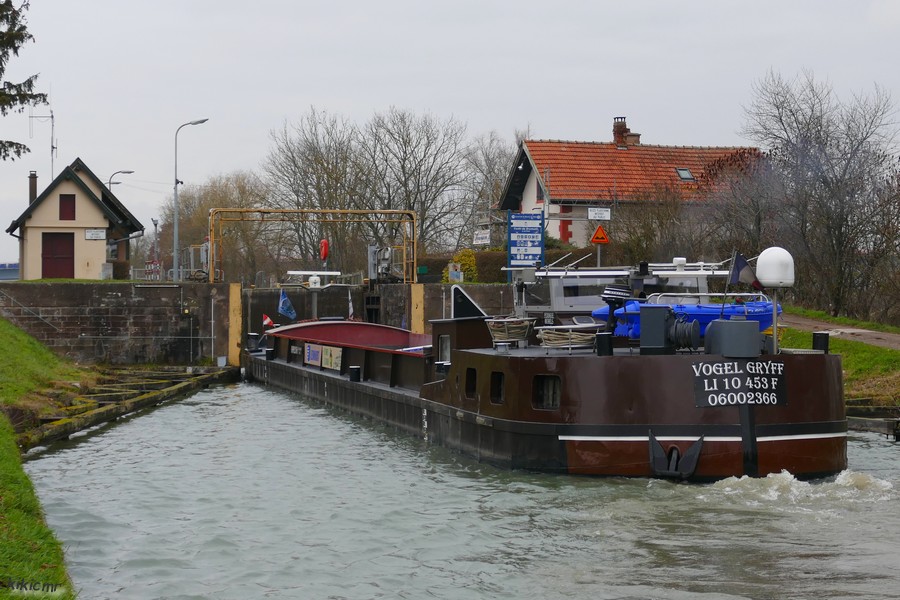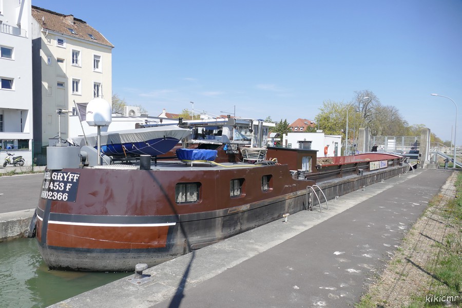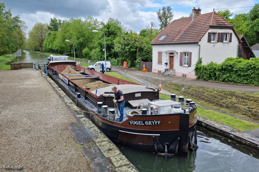 - en avril 2022, il était monté à Mulhouse sur le chantier d'aménagement du square de Gaulle en face de la gare SNCF où il évacuait les déblais du chantier vers le port de l'Île Napoléon ; le voici avalant dans la seule écluse du trajet, la 41 du canal du Rhône au Rhin :