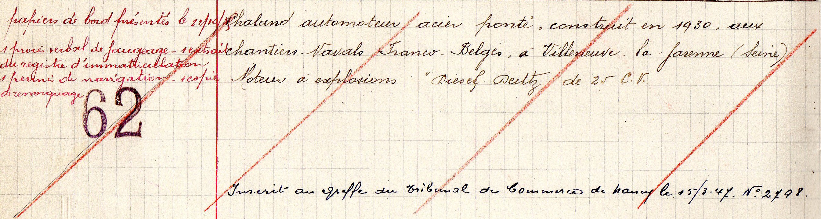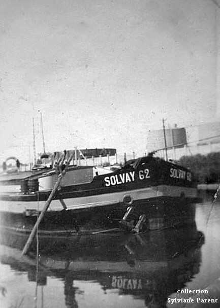 Le SOLVAY 62, construit par les chantiers navals franco-belges de Villeneuve-la-Garenne en 1930, a disparu pendant la seconde Guerre mondiale, c'est pour ça que dans le registre des bateaux interne à Solvay, sa fiche est rayée de rouge :