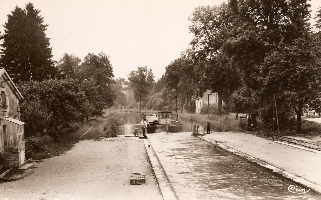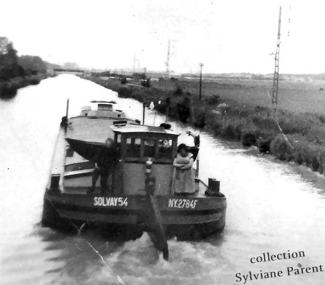 Et en plus, ce petit Solvay sorti des Chantiers Navals franco-belges de Villeneuve-la-Garenne, figure sur une jolie CPSM du canal de la Marne au Rhin, sur laquelle on le voit sortant chargé de l'écluse 22 du versant Marne du canal de la Marne au Rhin :