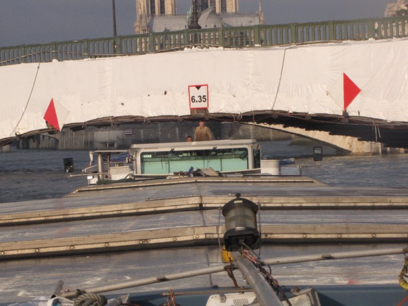 une photo d'aujourd'hui du passage montant a vide du pont Sully avec cette echaffaudage qui reduit le tirant d'air d'environ 80 cm du faite de ces travaux c'est le pont le plus bas de PARIS la cote d'Austerlizt est de 2.56 m