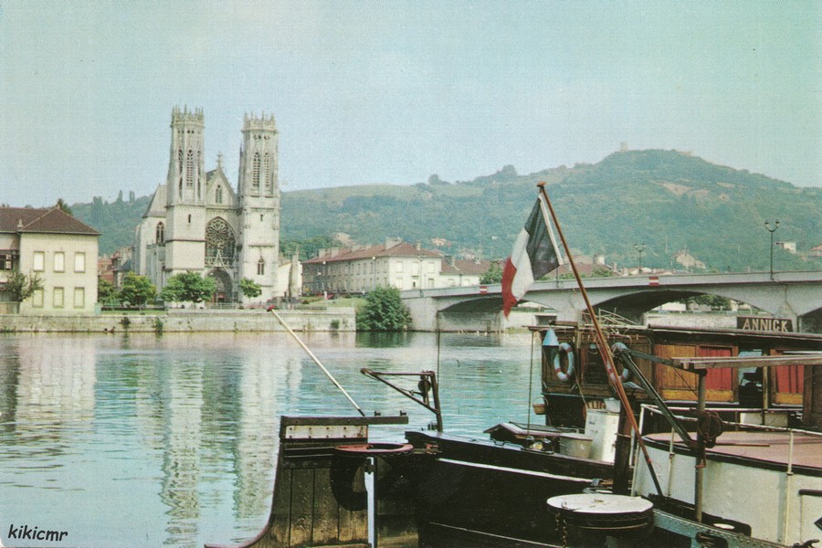 Deux bateaux amarrés sur la Moselle, sur cette carte postale de Pont-à-Mousson :