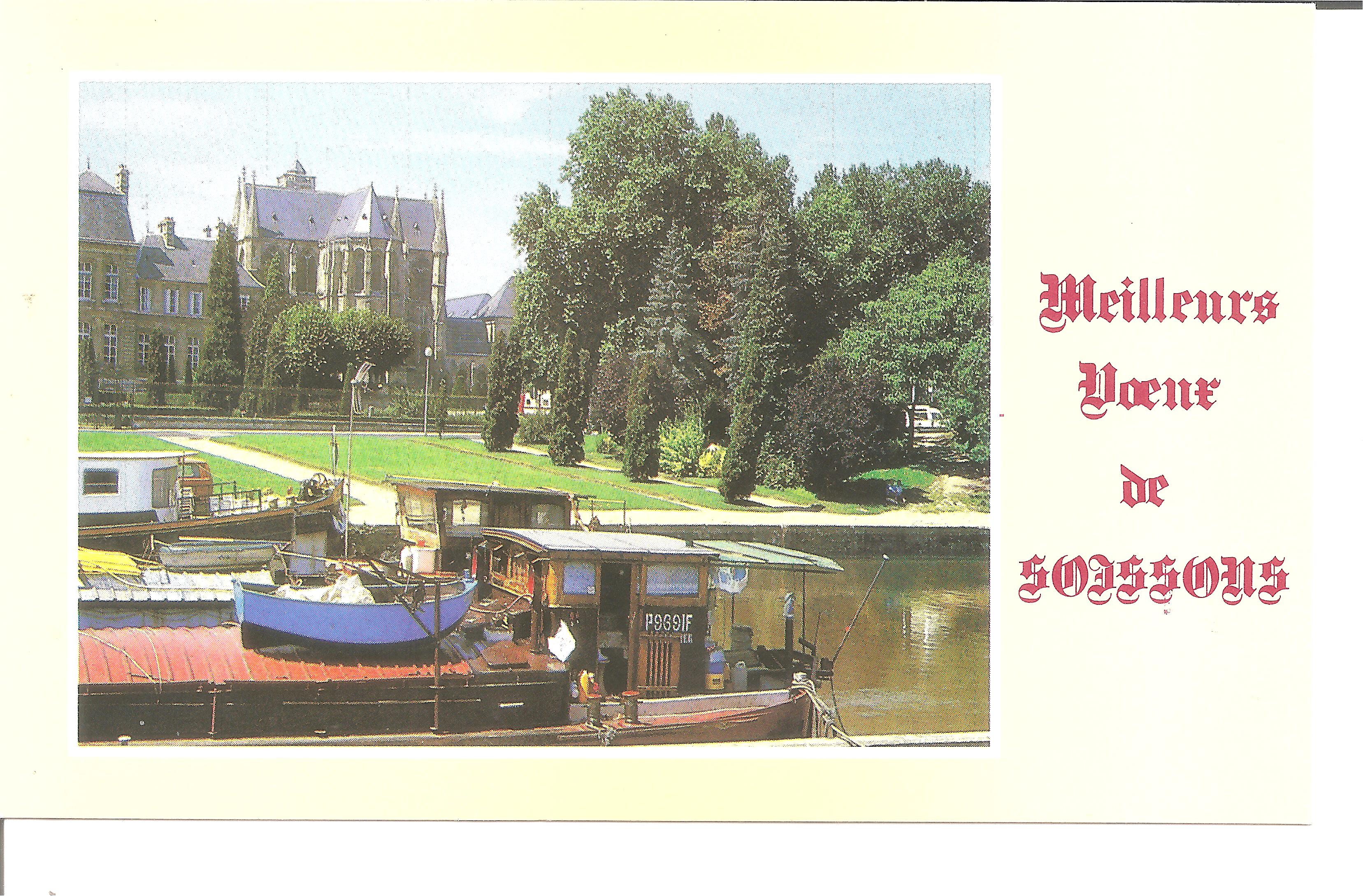 Sur cette carte de vœux des Éditions de l'Est (39100 Dôle) « Meilleurs vœux de Soissons », on peut voir l'abbaye Saint-Léger et des bateaux amarrés sur l'Aisne ; au premier plan, un gros numéro immatriculé