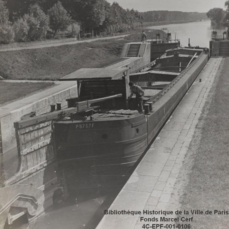 Une photo de Marcel Cerf trouvée sur le site de la Bibliothèque Historique de la Ville de Paris, avec un gros numéro immatriculé P9757F sortant d'une écluse. Ce n'est pas localisé, mais ça ne serait pas sur l'Oise, éventuellement ?