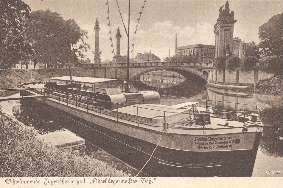 Et sur le site Deutsche Fotothek, on trouve cette photo de Paul W. John, intitulée « Berlin-Mitte. Hansaviertel. Die schwimmende Jugendherberge "Oberbürgermeister Böß" an der Hansabrücke », ce qu'on peut traduire par « Berlin-centre. Quartier de la Hanse. L'auberge de jeunesse flottante "Oberbürgermeister Böß" depuis le pont de la Hanse » (un pont sur la Spree). Elle a été prise entre 1925 et 1939 :