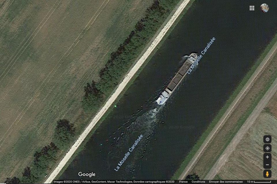 VERDUN sur des photos aériennes de Google Earth, prises le 26 juin 2019 pendant un chantier de dragage sur la Moselle canalisée, dans sa partie meurthe-et-mosellane : il est avalant, au-dessus de l'écluse de Fontenoy-sur-Moselle