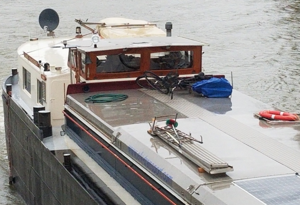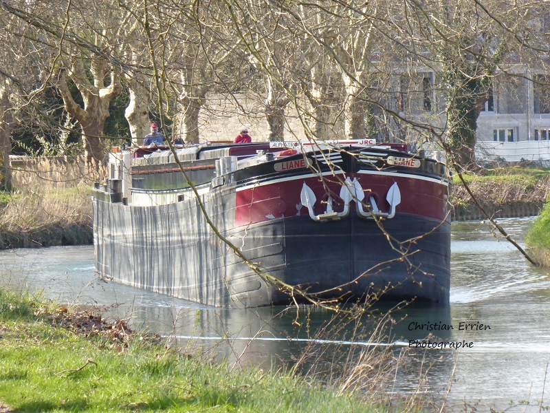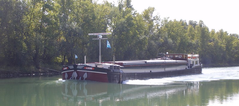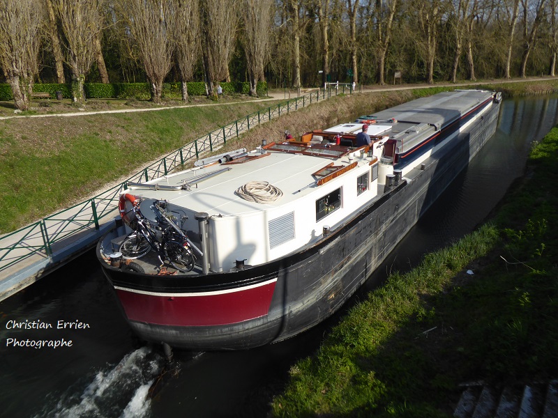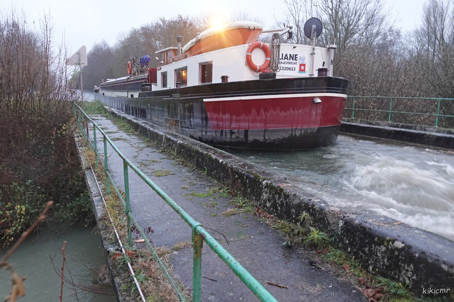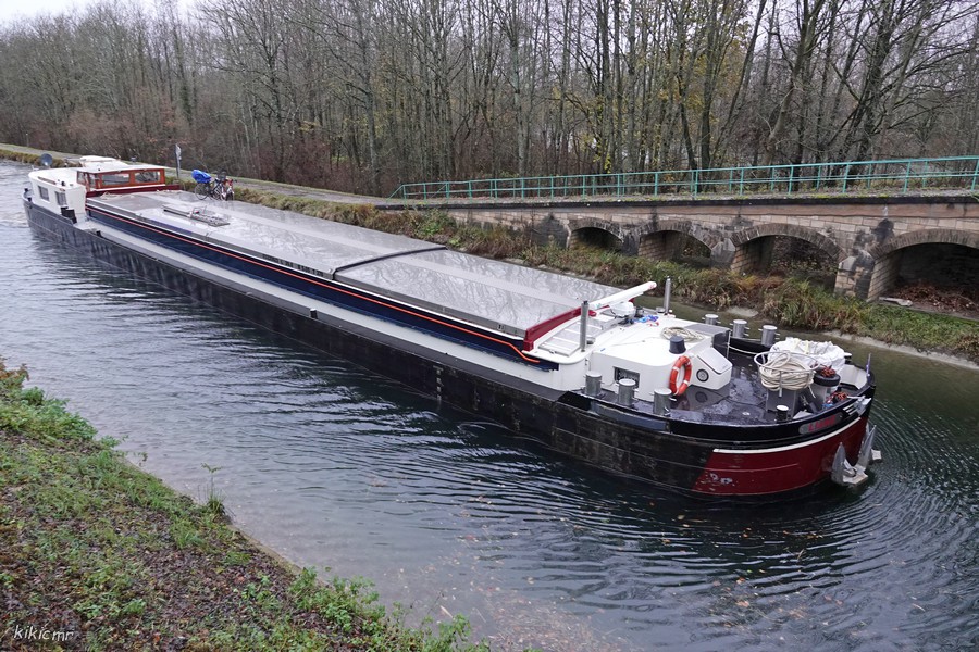 Et aujourd'hui, 9 décembre 2023, même destination : Contrisson, pour la même usine, mais cette fois c'est un voyage d'essai ; il a chargé du zinc sous la forme de barres de 1,8t à Genk (B), dans le canal Albert. L'usine Arcelor Mittal de Contrisson galvanise les coils qui arrivent bruts, et c'est ce processus de galvanisation qui nécessite du zinc, mais jusqu'à présent, il n'arrivait pas par la voie d'eau. Espérons que ce voyage d'essai soit concluant. En attendant, le voici montant à Étrepy (51), sur le canal de la Marne au Rhin dans la vallée de 70 :