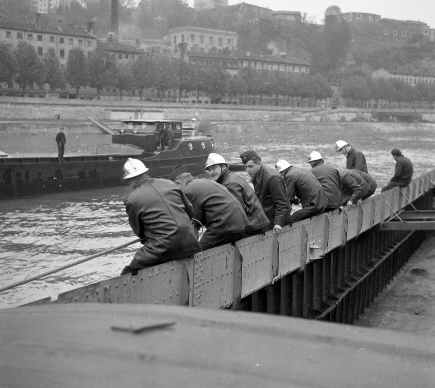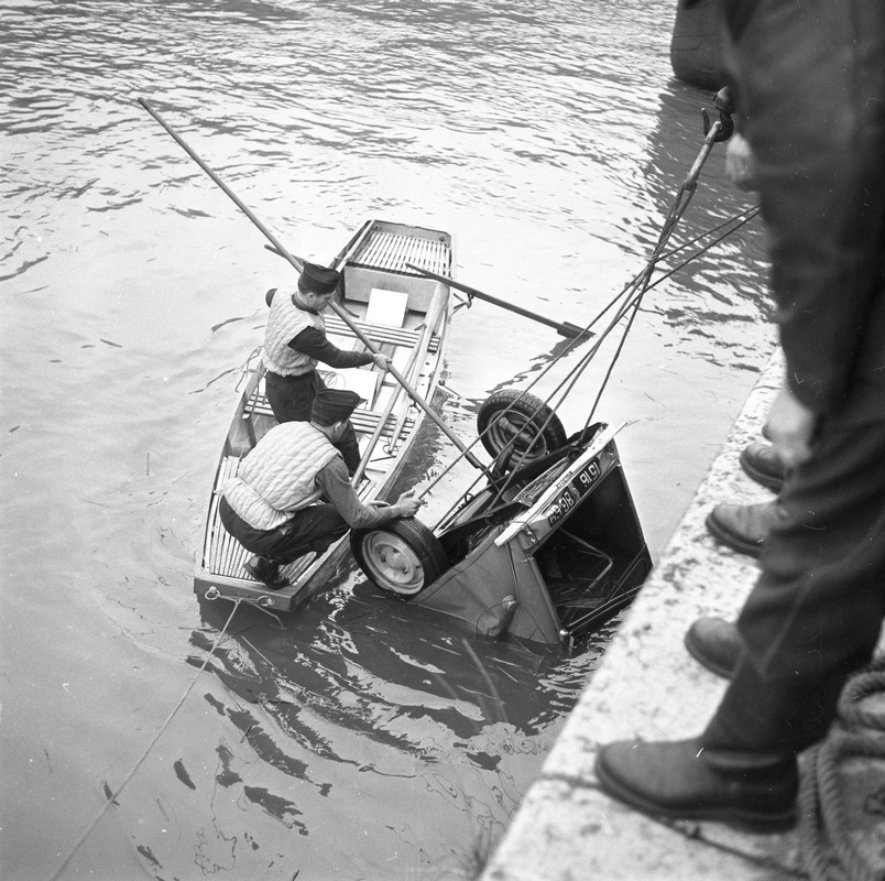 A hauteur du quai Arloing les pompiers sont mobilisés. Deux bateaux (Commodore et ?) et une barque sont réquisitionnés pour tenter de remonter à la surface une Citroën 2CV échouée au fond de la Saône.