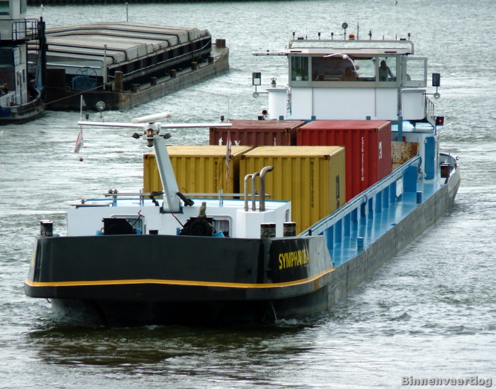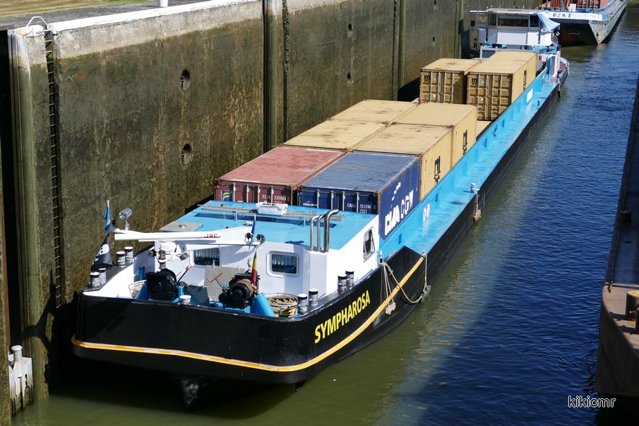 Sympharosa , 72,80 x 7,04 x 2,60 , 803 ton , Bouwjaar 1963 , Werf St. Pieter in Hemiksem ( België ) , 653 pk Mitsubishi en 320 pk DAF – van Tiem boegschroef , ex Aussenhafen , ex Karin , ex Harma , eigenaar Vof. MS Sympharosa (A. Haaima) in Terneuzen , ENI 02317043