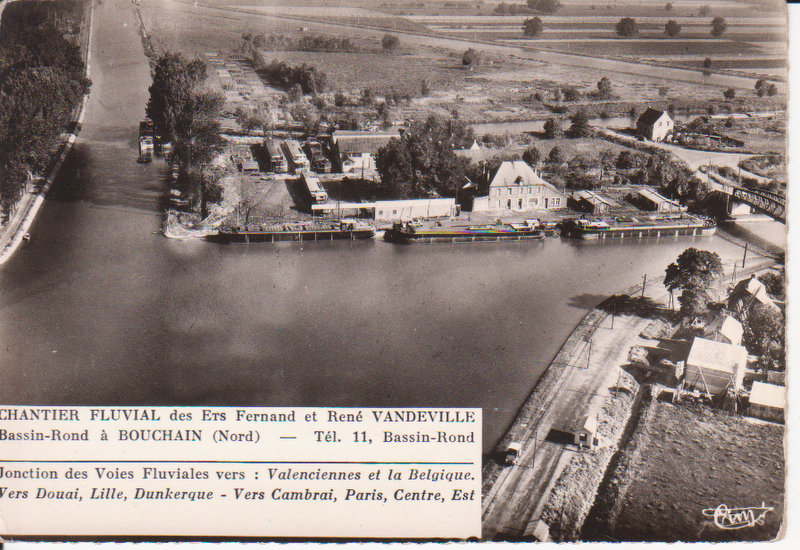 "Revue de la navigation intérieure et rhénane" du 25 mai 1951 : à l'occasion de l'inauguration du Port de Lille, une exposition sur le thème "Le progrès dans les transports, la manutention et l'emballage" s'est tenue dans le magasin n°2 et sur le quai de ce port du 4 au 7 mai 1951. (...) la batellerie avait rassemblé 28 unités représentant de nombreux types de bateaux (...) Signalons en passant une coque transformable gros porteur, puisqu'elle charge 272t à 1m80, sortie du chantier Fernand Vandeville, de Bassin-Rond (...)