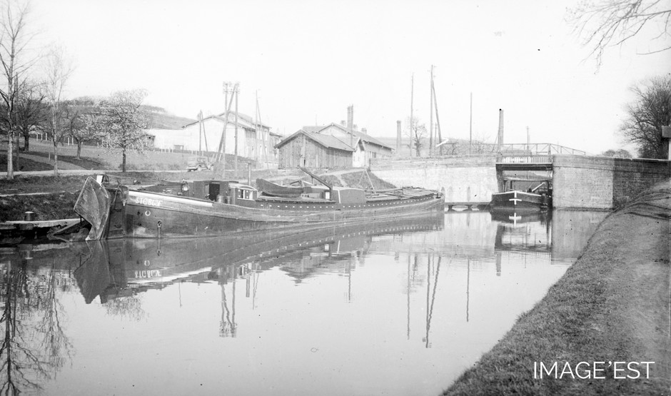 C'est l'écluse de Sommerviller (54), sur le canal de la Marne au Rhin. Une péniche sort de l'écluse, avalante, un montant attend à la patte d'oie, un mixte, non (bois/fer) ? Avec une grue de Sarralbe peut-être, et immatriculé