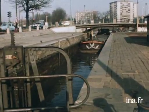 On y voit un bateau entrant dans une écluse :