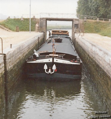 Nouvelle photo, toujours vu de l'avant : cette fois il est montant à Pouilly-sur-Meuse (55), écluse n°33 du canal de l'Est branche Nord, en 1982 (photo des archives de Marc Jaisson, par l'intermédiaire de Patrice Thiolière).