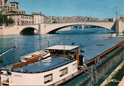 Péniches à quai sur le canal de la Marne au Rhin, à Nancy (Meurthe-et-Moselle), en 1987. En arrière-plan, à gauche, les Grands Moulins Vilgrain et l'ancien silo sur le canal, le long de la rue Sébastien Leclerc.