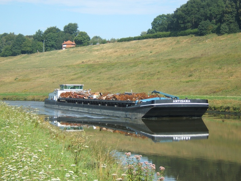 Je vous présente l'ANTISANA IVR 2319192 car il a été construit au chantier Wilmotte à Namêche en 1974. Il est de de passage à Seneffe, montant le canal de Charleroi Bruxelles et chargé de mitraille.