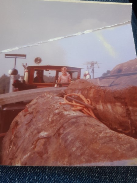 Montant chargé au départ du Havre avec des grumes. Photo de monsieur Ducout (il avait déjà son V12 GM) Je ne sais pas pour quelle raison, il y a eu 3 reportages Télé ( aux dires de Monsieur Ducout) lors de ce voyage. Sur la photo, l'on voit Monique devant la timonerie et Anselme à la barre. Pour le chantier, je me renseigne d'ici peu. Baron