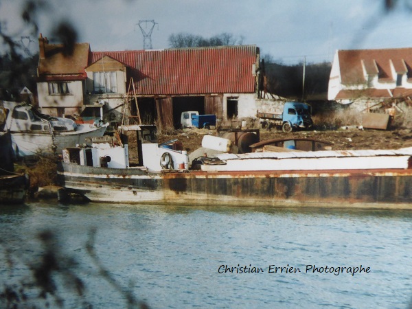 Voici les derniers instants de vie de ce bateau avant déchirage. Nous sommes en février 1996 à Courbéton (Montereau).Désolé pour la qualité médiocre de la photo mais j'ai du faire des acrobaties dans les branches depuis la rive d'en face.