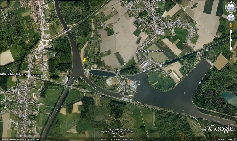 L'été dernier je m'étais promené à Péronnes et j'ai rencontré par hasard un ancien ouvrier de ce chantier sur l'Escaut. Il m'a dit qu'actuellement une ferme y a été construite(repère jaune avec le ?).