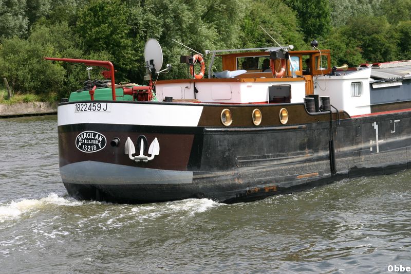 DARGILAN partait d'Arleux vers le chantier de Beez, avec, pour une dernière fois, Annie et William au macaron. Il sera raccourci à 30 mètres puis, par Nieuport, rejoindra l'Angleterre, où il servira de bureau sur la Tamise (photo et infos Roger Thiais et Cindy Caillez) :