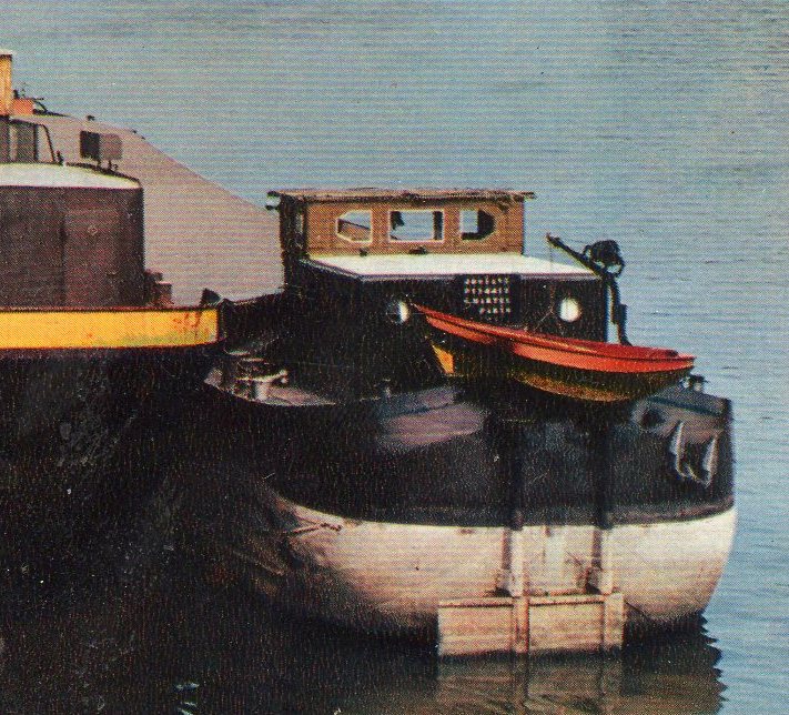 Il avait 2 gouvernails transmission a chaines et une petite timonerie a l'arriere de laquelle un bloc cuisine tres haut qui nessecité 60 tonnes de ballast en canal.