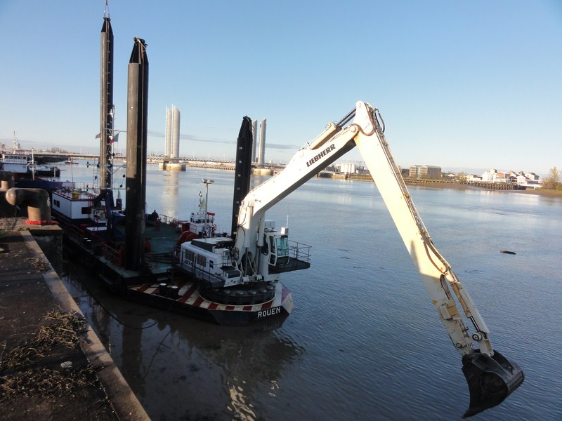 Cette pelle a été embarquée à la réception du ponton et remplacée ensuite par des Liebherr 974 la dernière en date étant une 974 sur tourelle.