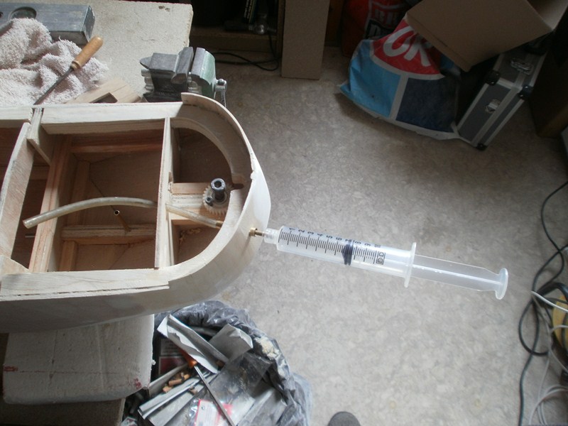 sur les images vous voyez une seringue que j'ai modifier pour facilité le graissage du tube d'étambot, elle est introduite dans un tube laiton de 6 mm dans lequel j'ai forcé mon tube plastique avec un retrait de 3 mm pour une question d’esthétique qui sort de la coque et qui ne sera autre que le tuyau d'échappement que l'on retrouve sur ces bateaux dans la réalité.