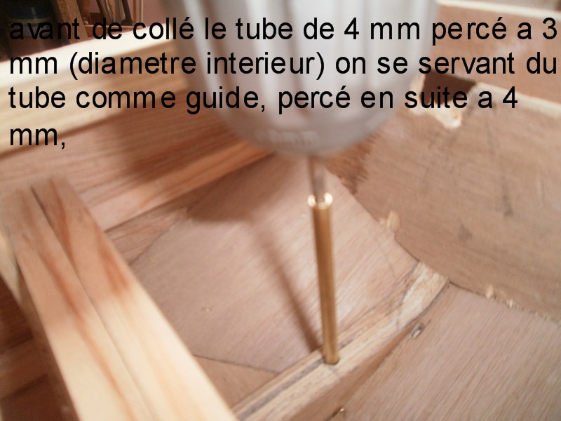 diamètre du tube de l'arbre d'hélice 6 mm, intérieur 5 mm, arbre 4 mm, donc en perçant a 4 mm on affaibli pas trop l'arbre, lors du collage du tube de graissage bien faire attention de ne pas frotté sur l'arbre d'hélice le tube étant en laiton et l'arbre en acier pas de problème de casse mais cela pourrais créé des grincements et des interférences que le récepteur n’apprécierais peut-être pas et une surcharge au niveau du moteur donc une consommation excessive en énergie.