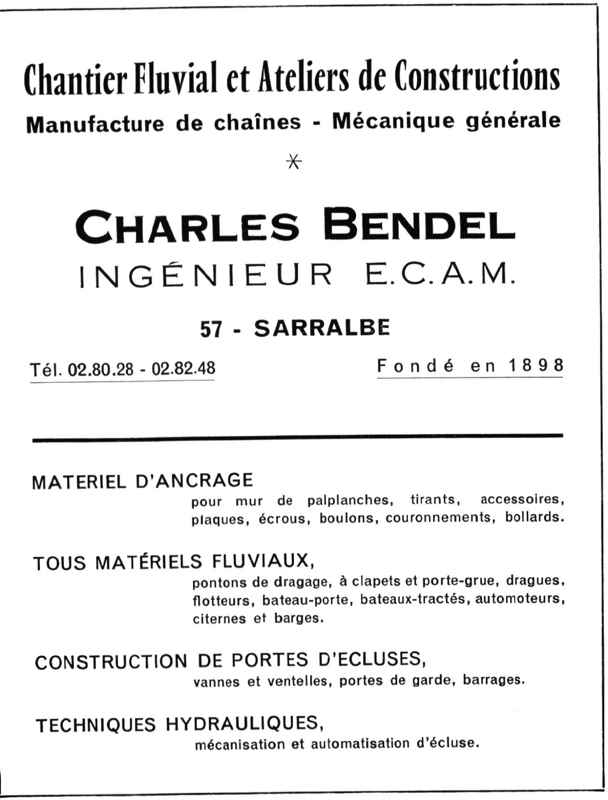 Charles Bendel, fils du fondateur, ingénieur des Arts et Métiers, reprit l'affaire en 1936 et la développa. Une cale sèche le long du canal des Houillères de la Sarre fut réalisée en 1945 pour la construction et la réparation des bateaux automoteurs ; une trentaine d'unités neuves sont sorties des chantiers Bendel, le dernier en 1962.
