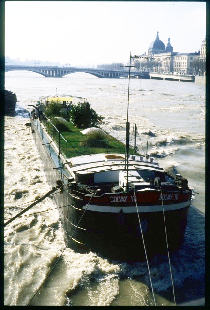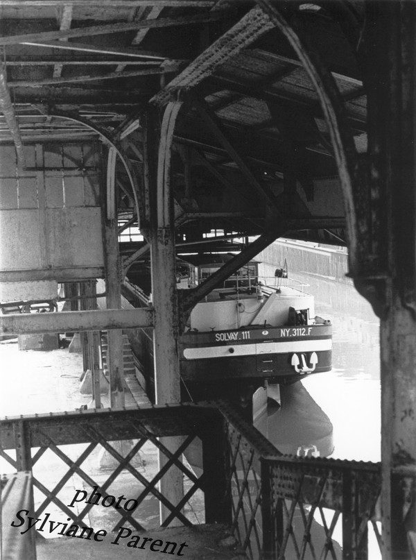 et une photo que j’ai prise en 1982, de la passerelle piéton qui enjambait le canal entre le chargement de soude en vrac et l’ancien chargement des cylindres de soude caustique (elle fut démontée début 1990), et que j’aime particulièrement, qui allie la flotte et l’architecture des installations, le