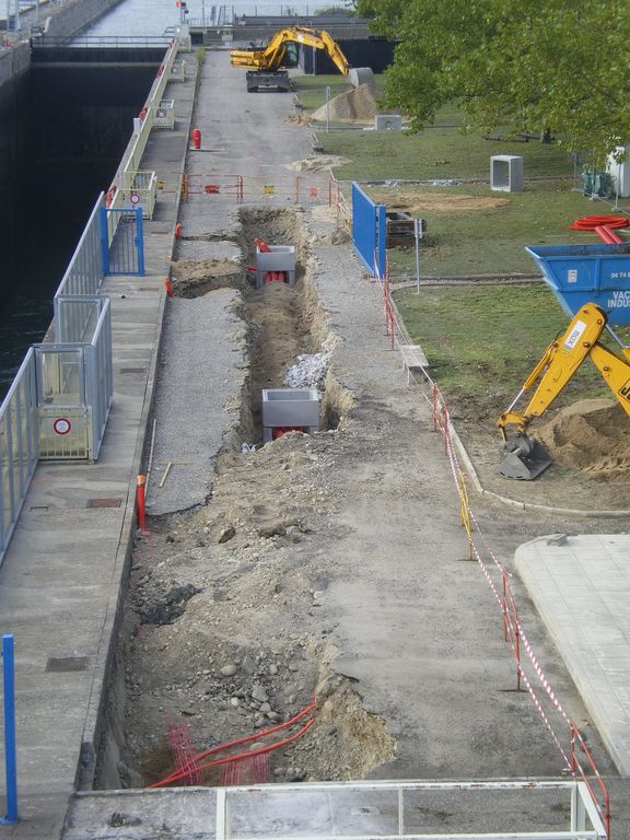Il y a eu aussi des opérations "carotage". La dalle au desus du bloc de vannage est importante : peut-être 50 m x 30 m et d'une épaisseur de 2 m par endroit.(hauteur en dessous 15 à 20 m) Sur cette dalle les camions et grues peut y circuler sans problème. La personne chargée du carotage, mettait parfois une journée ou plus pour effectuer un trou.