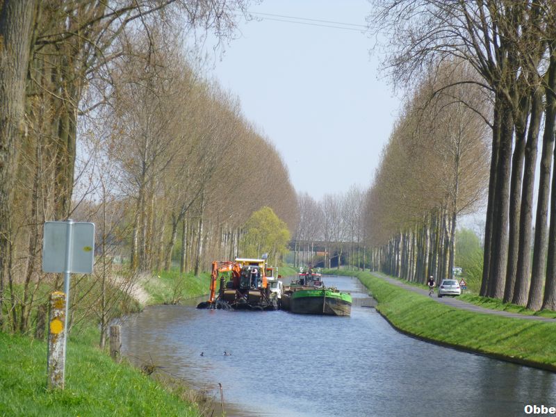 Dragage de l'Espierre du coté d'Estaimpuis Saint Leger. A la pousse des barges.