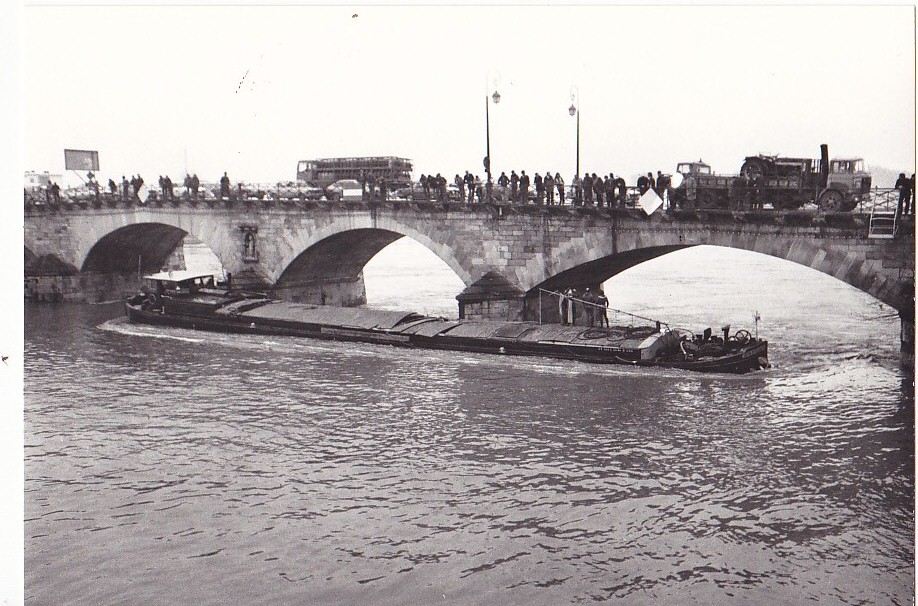 Le 9 janvier 1980, la péniche “La Renaissance” s’est mise en travers de la Saône sous le pont Saint-Laurent de Mâcon, déversant ses quelque 240 à 250 tonnes de maïs et s'est éventrée sur l'une des piles du pont. (Source : Claudine Schaller / Le Journal de Saône-et-Loire le 17 août 2020)
