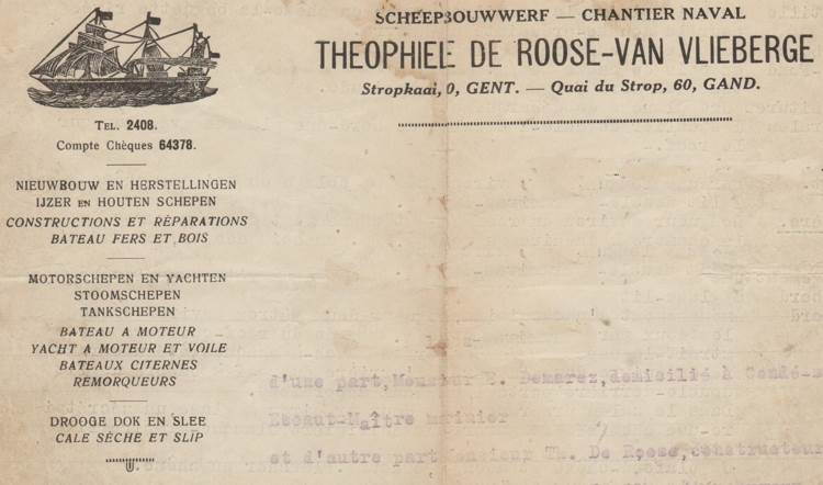 DIDEROT datant de 1929, je vous garantis qu'il portait bien un entête "Pol de Roose" ! Je ne me souviens plus de l'adresse, et il est peut-être bien trop fragile pour être numérisé... Reine m'a parlé de "Pol de Roose, Chantier du Strop dans la ville de Gand", c'est peut-être ce qui est écrit sur le contrat.