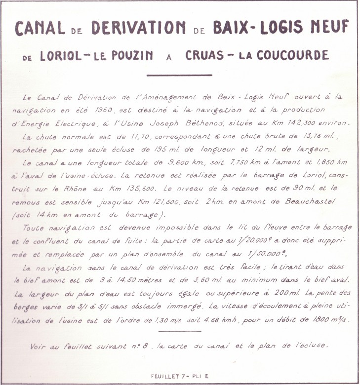 * la remontée prévue des eaux en amont du barrage met les égouts en dessous du niveau du Rhône. Il faut donc construire une galerie pour amener les eaux usées et les eaux pluviales, séparément, en aval du barrage. cette galerie passe en siphon sous la rivière Ouvèze (l'ardéchoise), et donc dans son lit, pour réaliser cet ouvrage, se trouvent grues, camions, centrales à béton, etc... Une nuit de gros orages (printemps 1959), la rivière est montée brusquement, et tout le matériel est.. descendu jusqu'au fleuve. mais cette Ouvèze là ne fut pas meurtrière comme son homonyme vauclusienne, le 22 septembre 1992.