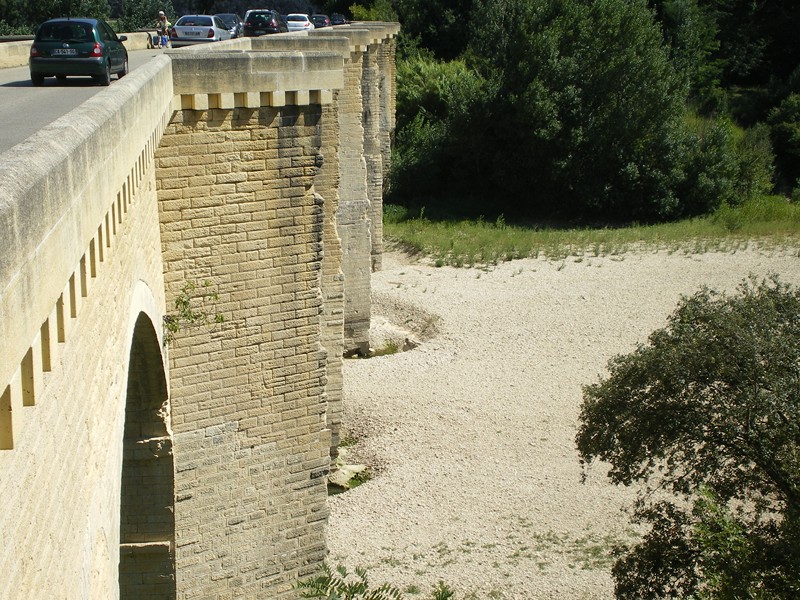 Je ne connais pas ce pont en particulier, mais vu l'environnement, large rivière, sans eau temporairement, architecture des habitations, je pencherai vers une rivière descendant des Cévennes. Il ne verra donc jamais de bateaux !..