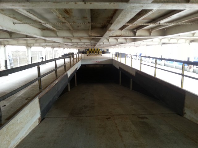 - Vue du pont principal vers le pont inférieur, rampe d'accès au fond de cale.
