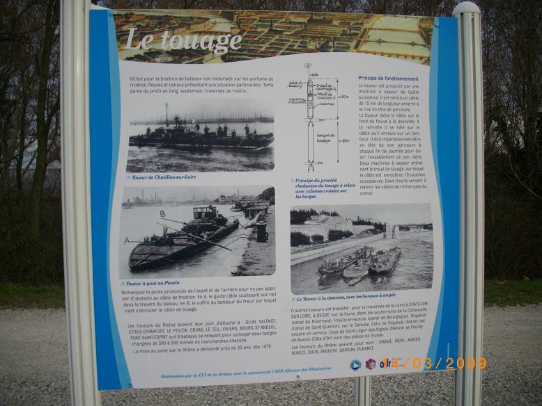 Le touage s'effectue sur 8 sections : Pont-saint-Esprit-Bourg-Saint-Andéol ; Bourg-Saint-Andéol-Viviers ; Viviers-Le Teil ; Le Teil-Cruas ; Cruas-Le Pouzin ; Le Pouzin-Chamfort ; Chamfort-Valence ; Valence-Les Combeaux. Quelquefois, un toueur montait jusqu'à Vion (PK86)...."
