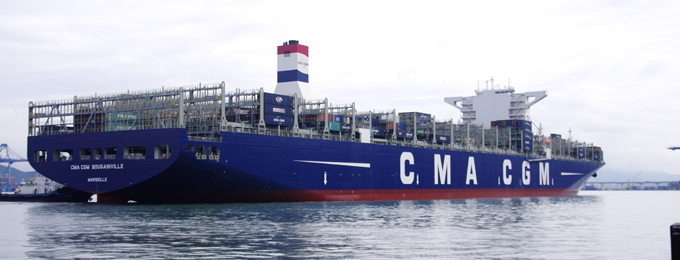 "Le BOUGAINVILLE, le plus grand porte-conteneurs au monde battant pavillon français est marseillais. Inauguré début octobre (6/10/2015 par F. Hollande), ce géant des mers de plus de 400 m (exagération marseillaise) de long de la compagnie marseillaise CMA CGM est entré en service (25/08/2015) sur la ligne Asie-Europe".