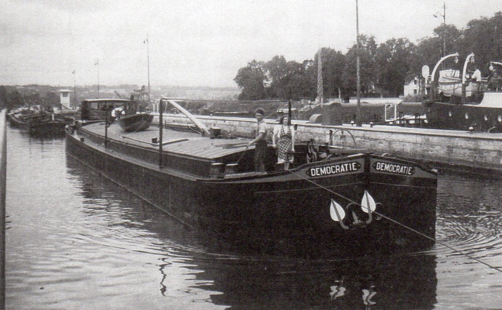 DEMOCRATIE au pont-levis de Malzéville, à Nancy (54), sur le canal de la Marne au Rhin ; sur les toutes premières images (un gros plan sur le cul du bateau), on lit clairement que le matricule commence par