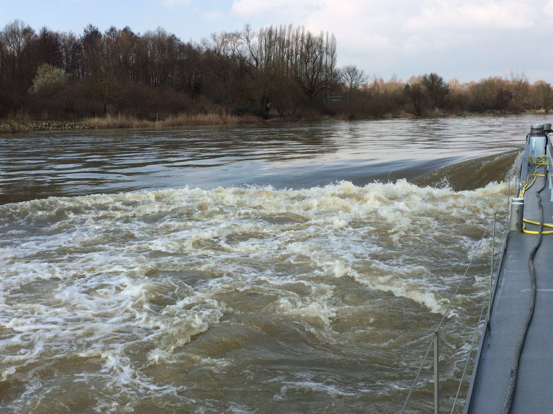 Je ne pense pas qu`il soit trop compliqué d`aller sans la barge si necessaire. J`ajoute une photo d`un bateau coupé de la même facon (c`est-à-dire avec un nez rectangulaire) qui va seul pour aller chercher sa barge sur la Moselle.